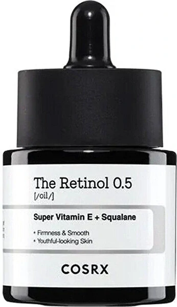 COSRX - The Retinol 0.5 Oil - pleťové sérum proti vráskám. Obsahuje retinol v koncentraci 0,5 %, který stimuluje produkci kolagenu, čímž zabraňuje prohlubování vrásek, sjednocuje tón pleti a redukuje nedokonalosti. Přípravek byl dále obohacen o skvalan a sójový olej, které obnovují ochrannou bariéru pokožky a zanechávají pleť příjemně měkkou na dotek a vitamín E, který má antioxidační účinky. Sérum má olejovou konzistenci.