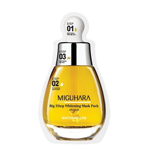 Miguhara - Big3 Step Whitening Mask Pack Origin - produkt 3 v 1 na obličej. Skládá se ze tří kroků péče - ampule, masky v hadříku a krému, které pomáhají srovnat tón pleti a hydratují pleť. Složení ampule je založeno na hydrosolu z heřmánku římského , který má protidráždivé a protizánětlivé vlastnosti. Pleťová maska obsahuje hydratační kyselinu hyaluronovou a citronový olej , které zajišťují krásný jas a sjednocují tón pleti, zatímco krém obsahuje spoustu peptidů podporujících pružnost . Každý produkt obsahuje filtrát z kvasnic Galactomyces urychlující regeneraci a niacinamid pro zesvětlení zabarvení a podporu ochranné bariéry pokožky, čímž se snižuje riziko podráždění.