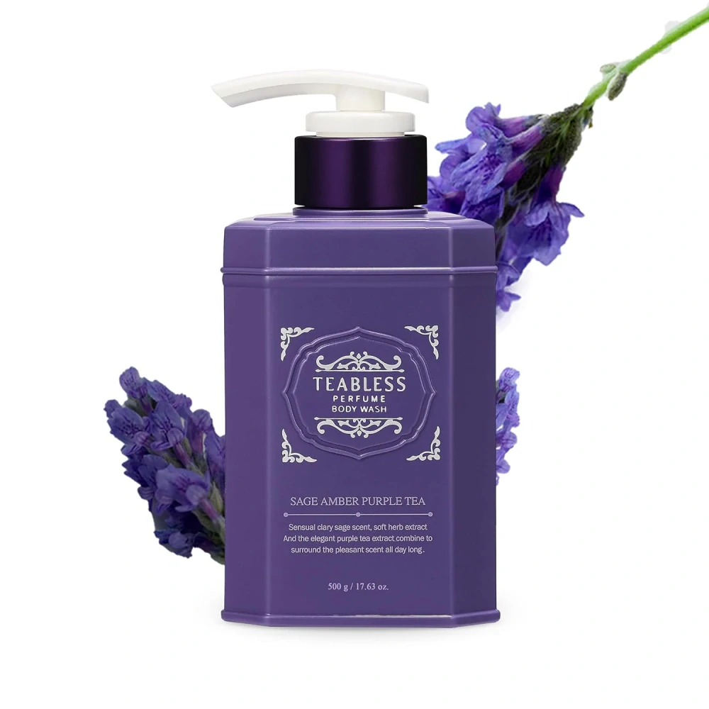 Parfémovaný tělový gel, šalvějový jantarově fialový čaj (17,63 oz/500 ml) – hydratační tělový čistič pro citlivou pokožku – korejská péče o pleť s bylinkami – jemná, hydratační, nelepivá, květinově dřevitá vůně